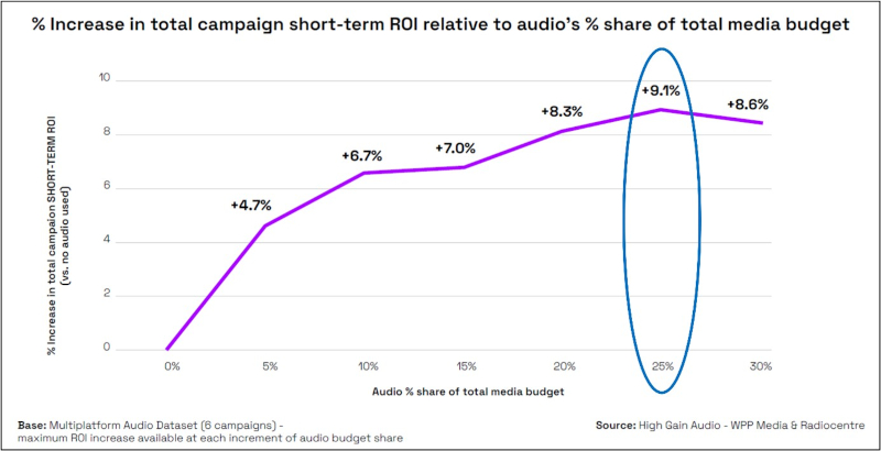 The report finds that allocating 25% of total media spend to audio delivers the strongest uplift, with overall campaign ROI 9% higher than campaigns without audio in the mix.